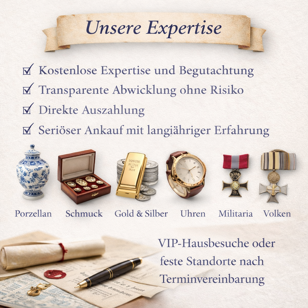 Willkommen bei Auktionshaus von Falkenberg – Ihrem seriösen Ansprechpartner für den Ankauf von wertvollen Gegenständen. Wir verstehen, dass der Verkauf von Schätzen eine wichtige Entscheidung ist. Deshalb bieten wir Ihnen einen transparenten und vertrauenswürdigen Service, der auf langjähriger Erfahrung basiert.